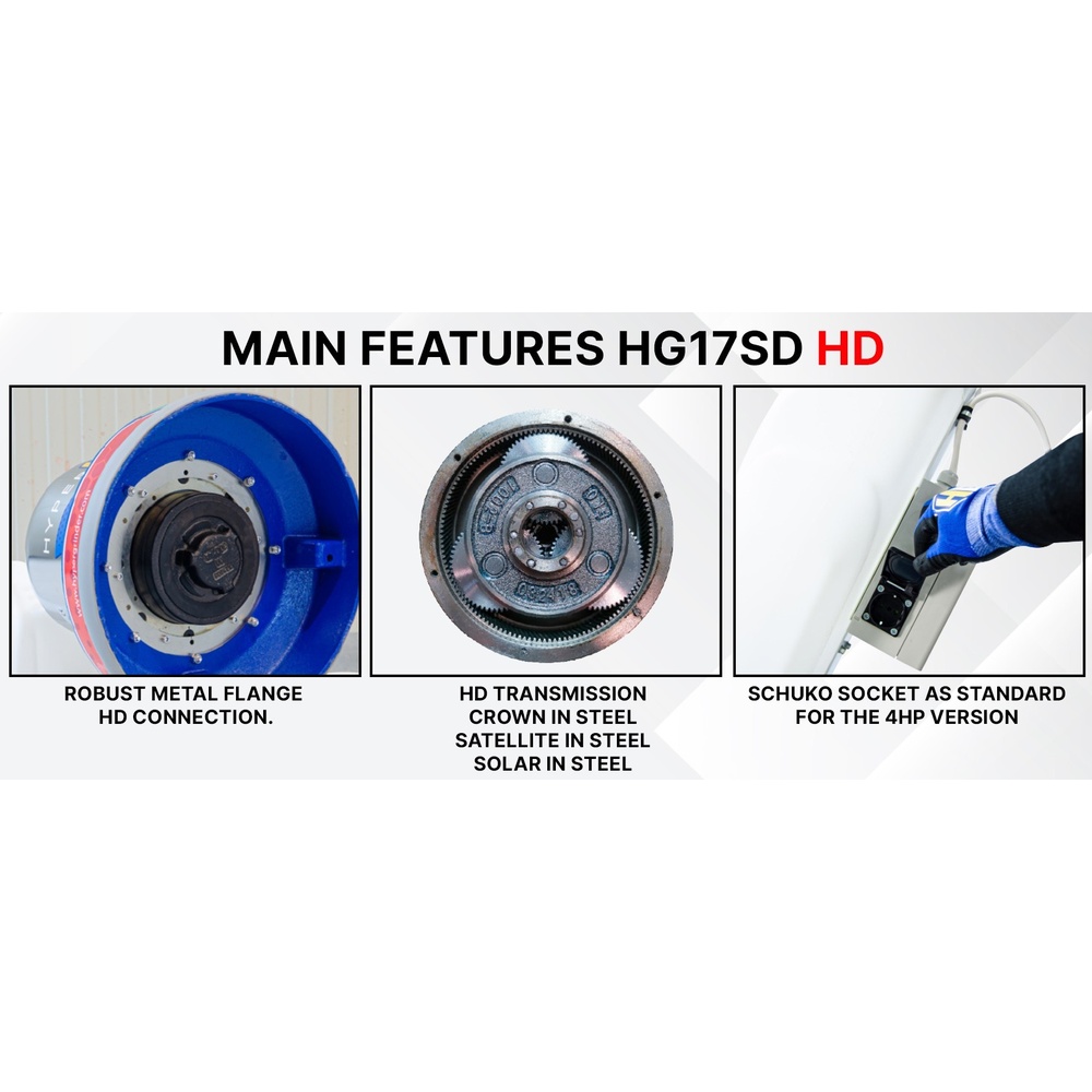 HG17SD HD METAL: Suitable for heavy-duty applications. The METAL model with a helical gear reducer is the ideal solution for daily cleaning, offering unprecedented simplicity and speed. This single-disc machine is extremely versatile and highly maneuverable, perfectly adaptable to any type of floor surface, from linoleum to porcelain stoneware tiles, as well as resin floors, porphyry, granite, and concrete. With the HG17SD METAL, there is no surface you can’t work on! Its excellent performance guarantees efficient usage and a shiny result on every surface.