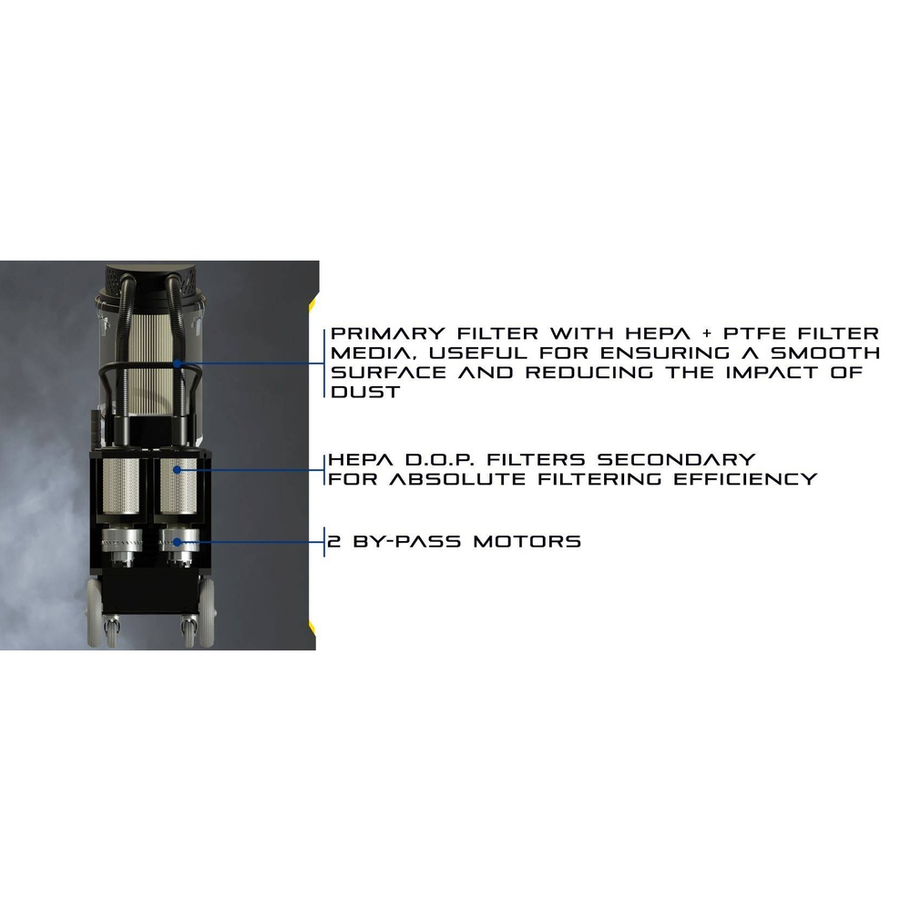 >Dual motors – 2 sets of HEPA D.O.P. spare filters – 1 main filter set HEPA + PTFE