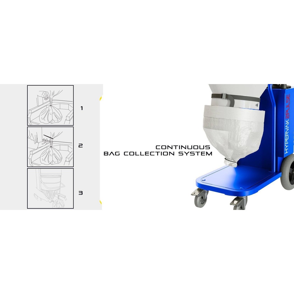 >Continuous bagged dust collection system for safe disposal of vacuumed material without contaminating the environment or respiratory system
