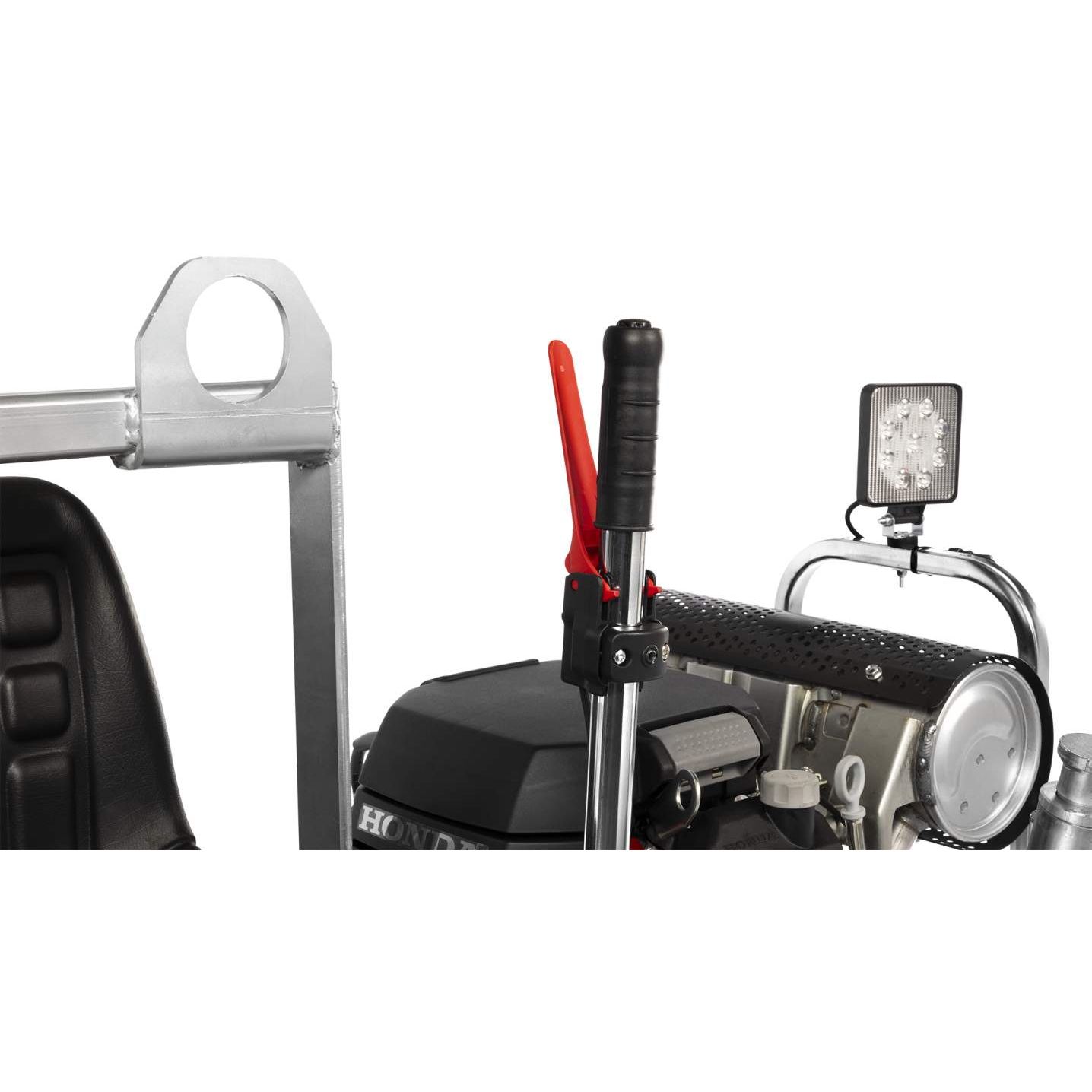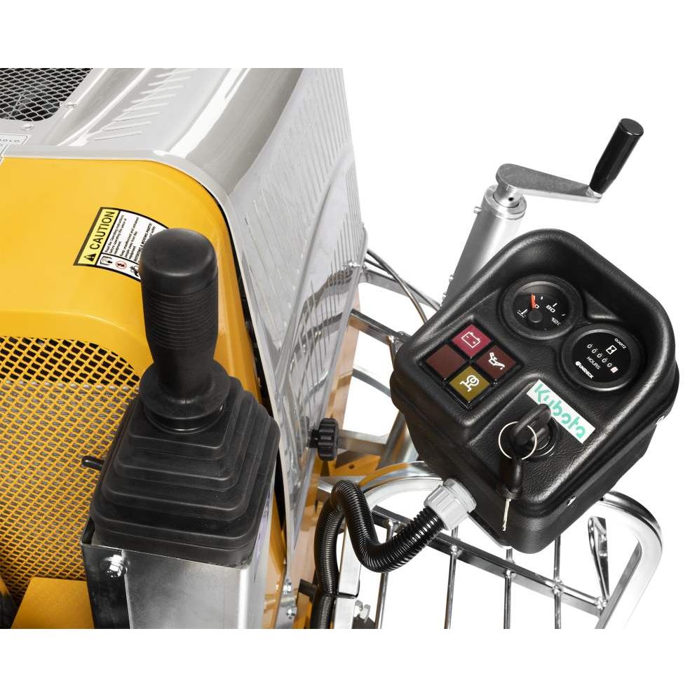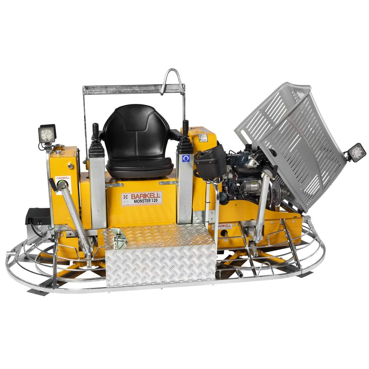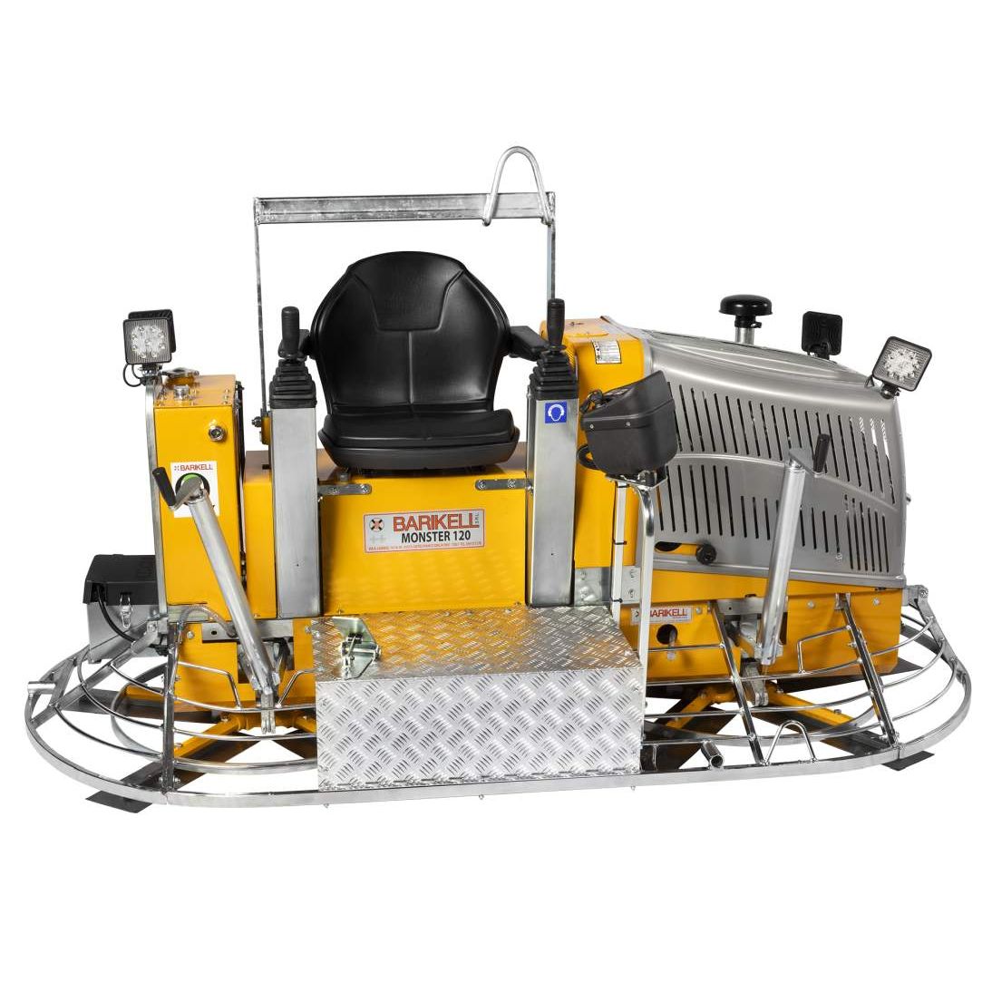 The machine is equipped with two Ø120 cm rotors, each fitted with eight non-overlapping trowel blades. It features hydraulic controls and an elevated operator seat.