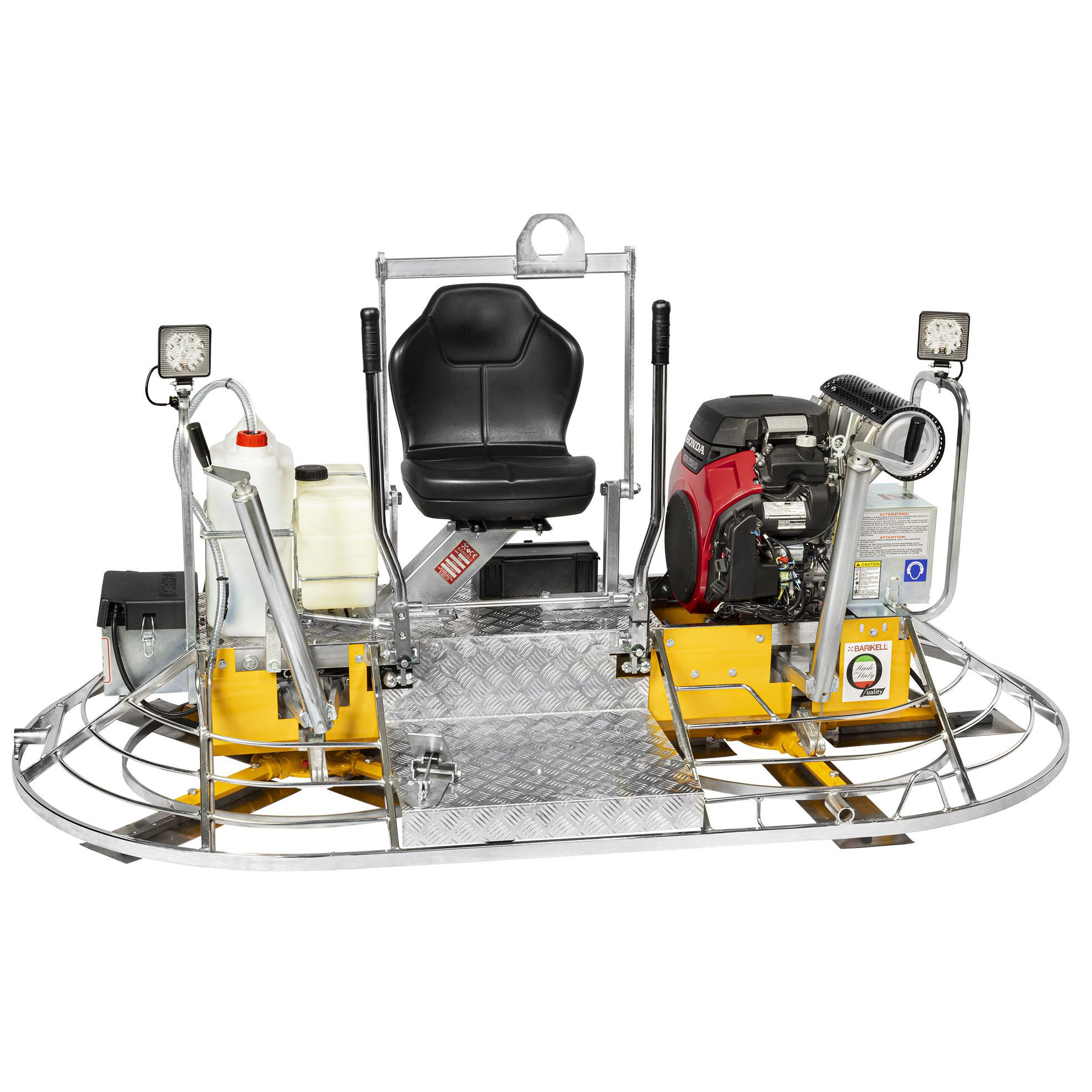Ride-on power trowel, designed for large-scale concrete finishing applications. It is equipped with two Ø120 cm rotors, each fitted with eight overlapping trowel blades. Operation is controlled via a foot-operated throttle, and the machine includes stabilizing rings to ensure balance and operational stability.