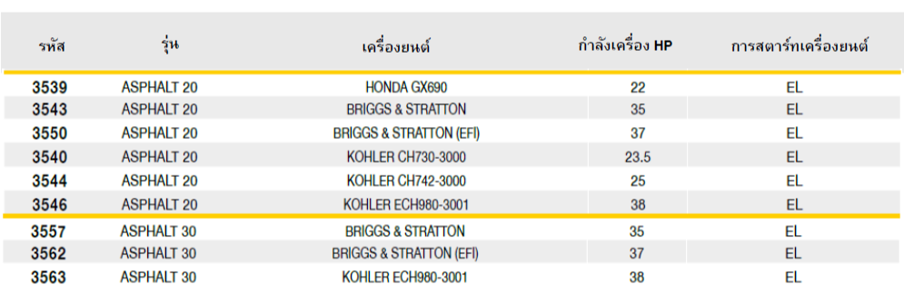 ตัวเครื่องมาพร้อมถังเก็บน้ำเหล็กขนาด 80 ลิตร สำหรับรุ่น Asphalt 20 และขนาด 100 ลิตร สำหรับรุ่น Asphalt 30 สามารถปรับความลึกในการตัดได้ด้วยระบบไฮดรอลิกโดยใช้คันบังคับแบบมือ (หรือปั๊มไฟฟ้าตามคำขอ) เพื่อความหลากหลายของความลึกในการตัด สามารถใช้ใบตัดได้สูงสุดถึง 450 มม. สำหรับรุ่น Asphalt 20 และ 600 มม. สำหรับรุ่น Asphalt 30 นอกจากนี้ยังสามารถติดตั้งใบตัดใบที่2 ที่ด้านตรงข้ามได้อีกด้วย ตัวเครื่องไม่มีใบตัดมาให้ในชุด