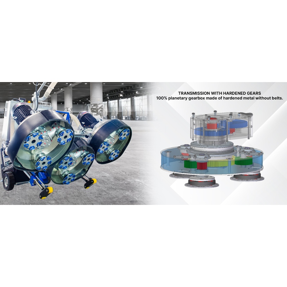 เครื่องขัดพื้นสุดล้ำที่ผลิตในอิตาลี มาพร้อมกับ สามหัวขัด ขนาด Ø 750 มม.และ จานรองเครื่องมือ 9 ชิ้น ขนาด Ø 240 มม. ทำให้มีหน้ากว้างในการทำงานรวม 2,120 มม. รุ่น HE 2100 มม. เป็นโซลูชั่นขั้นสูงสำหรับการแปรรูปพื้นผิวขนาดใหญ่ มันรับประกันการขัดที่ไร้ที่ติและประสิทธิภาพที่น่าประทับใจในด้านของผลผลิตและคุณภาพ คุณสมบัติหลัก: